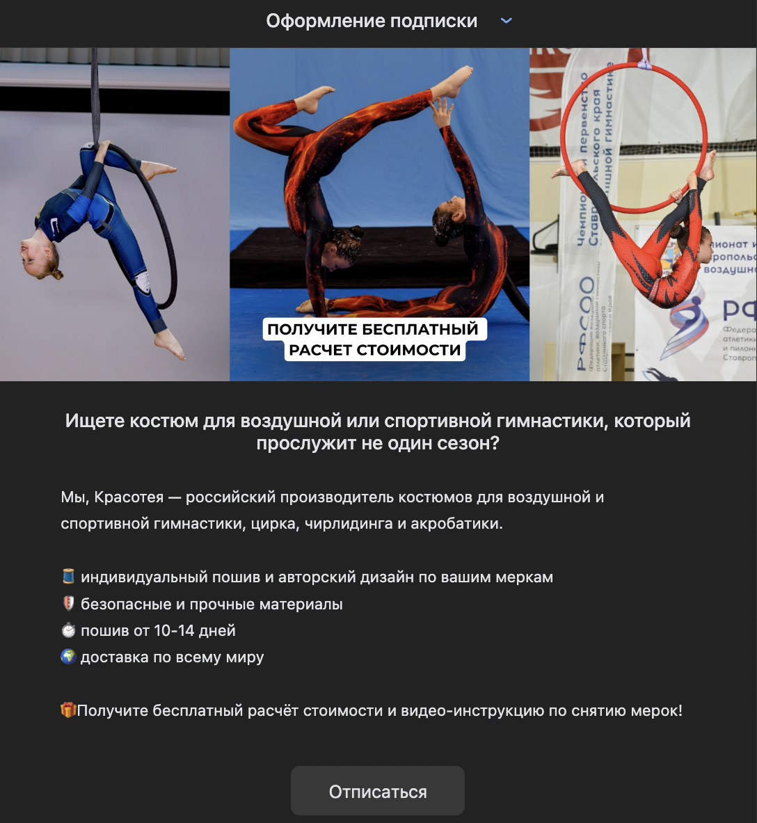 Оффер: бесплатный расчет стоимости костюма и подробная видеоинструкция по снятию мерок.
